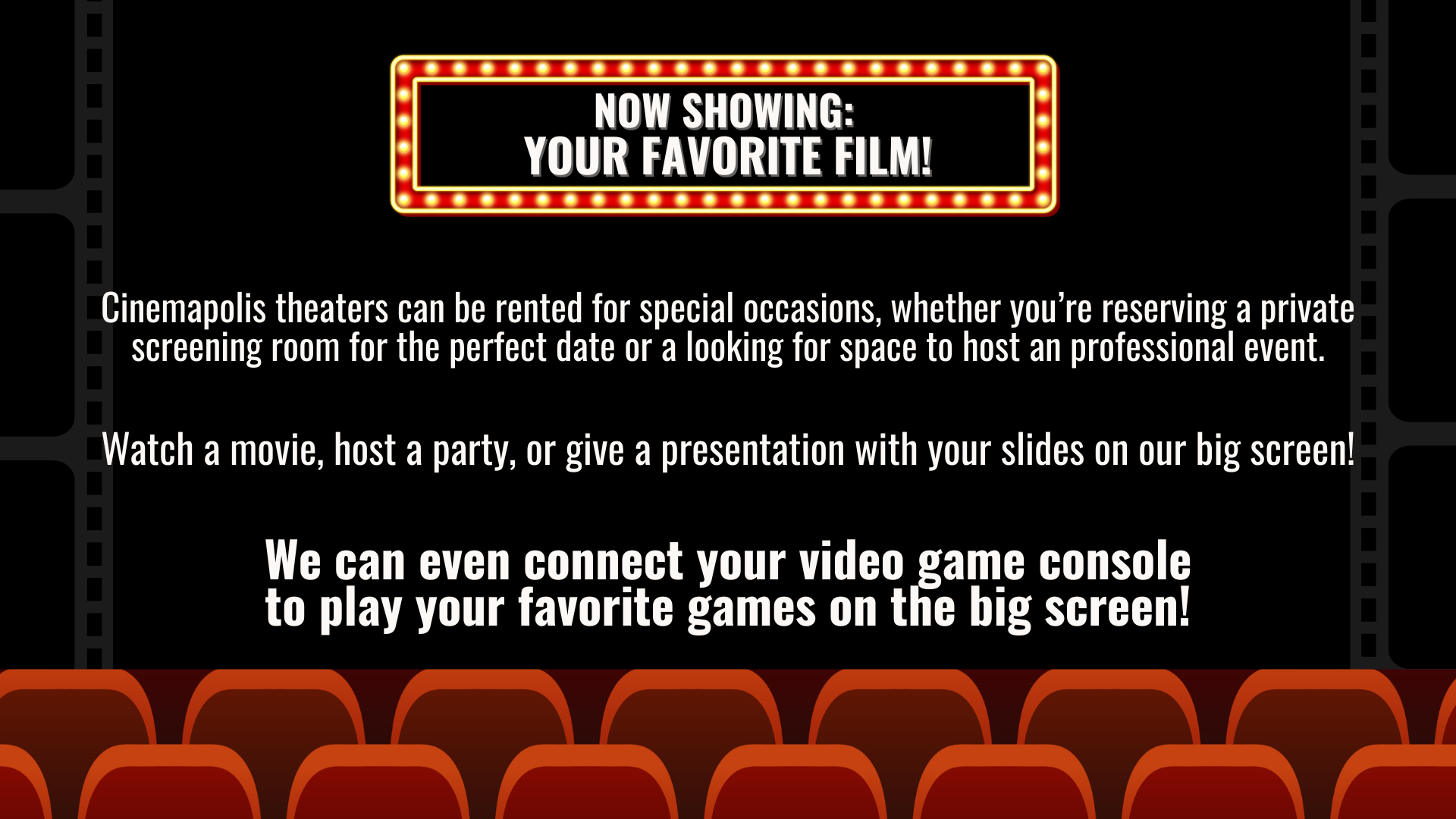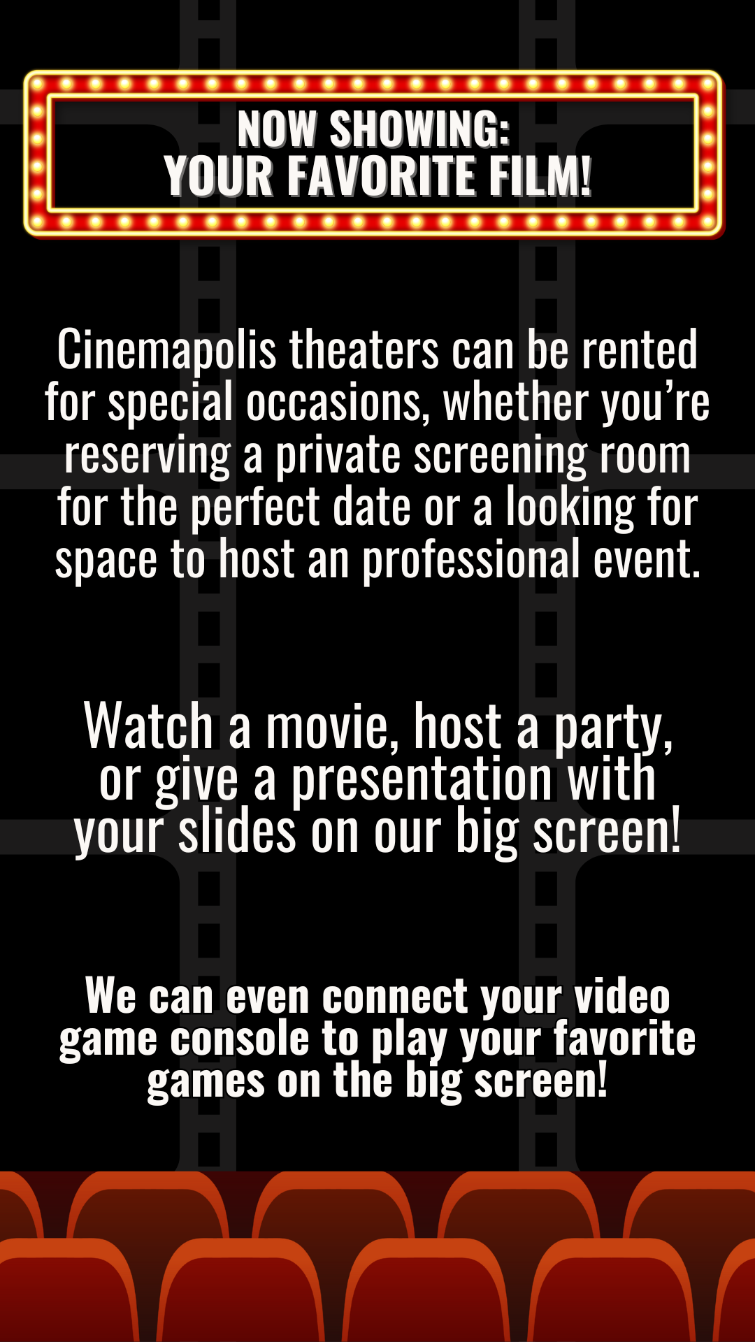 - Cinemapolis theaters can be rented any time! There is a two hour minimum for rentals that begin between 2 pm and 8 pm. We can open early for on Saturday and Sunday for rentals taking place from 11 am to 1 pm