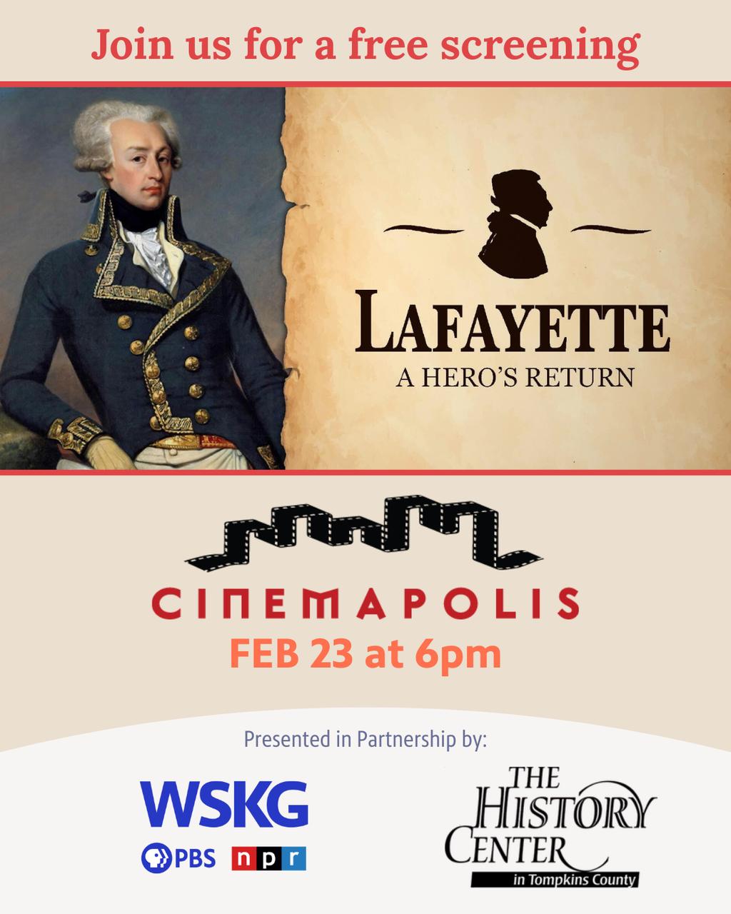 This screening will be followed by a discussion led by Lafayette scholar Laurent Ferri. This event is free and open to the public.PT2H2026-02-23Lafayette: A Hero's Return"Lafayette: A Hero's Return"Showtimes