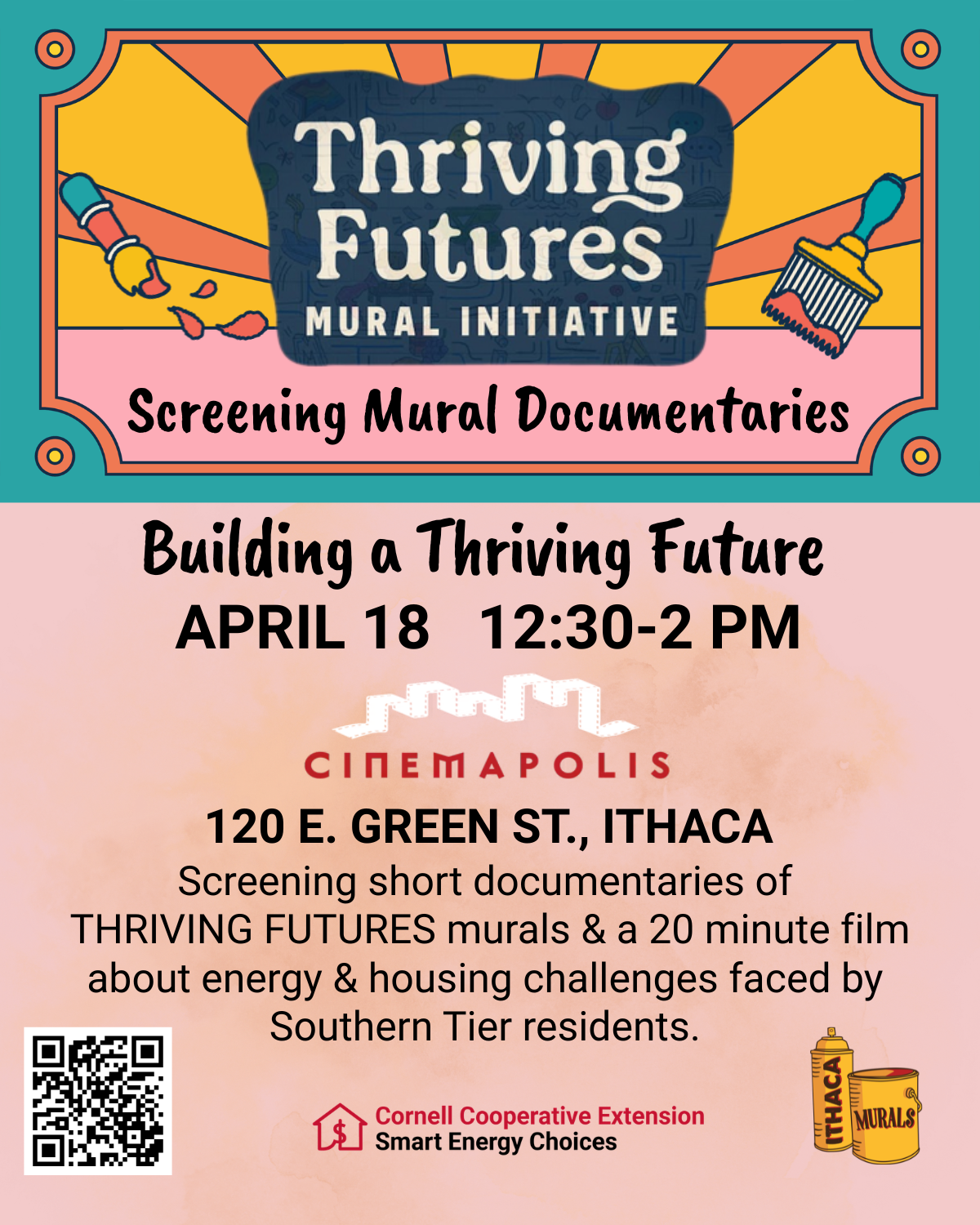 A free film screening of five brief Thriving Futures Mural Initiative artist documentaries on April 18 from 12:30pm to 2pm at Cinemapolis. These shorter pieces will be accompanied by a short documentary, on barriers to clean energy in the Southern Tier region, especially related to lower-income households, and some ideas for solutions.